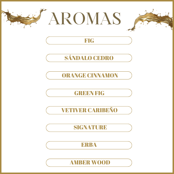 Elegí entre los aromas disponibles: Green Fig, Orange Cinnamon, Cedar Sandal, Vetiver Caribeño, Signature, Fig, Erba y Amber Wood.